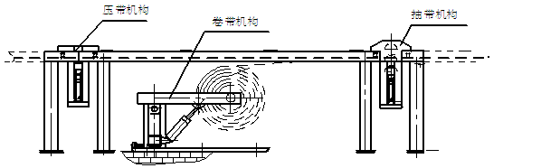 2、 啟動(dòng)拉緊機(jī)構(gòu)進(jìn)行松繩,拉緊小車同時(shí)送開(kāi)皮帶。開(kāi)啟抽帶機(jī)構(gòu)的液壓馬達(dá)驅(qū)動(dòng)固定輥,使其順時(shí)針旋轉(zhuǎn),通過(guò)固定輥和活動(dòng)輥的摩擦力將皮帶滾出,使皮帶在壓帶機(jī)構(gòu)和抽帶機(jī)構(gòu)之間縮曲,用剪刀剪斷,將皮帶斷頭安裝在卷帶機(jī)上。