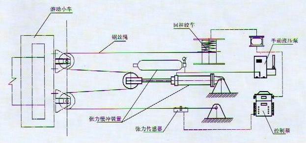 本裝置主要由基座、張緊絞車、液壓張力緩沖裝置、控制箱和張力傳感器五部分組成。圖示中的鋼絲繩由用戶提供,游動小車是皮帶機部件。張緊動作可根據需要實現變頻控制。 該型號張緊裝置結構簡單、經濟可靠、為免維護型張緊裝置?捎迷诓擅汗ぷ髅。